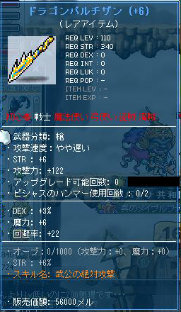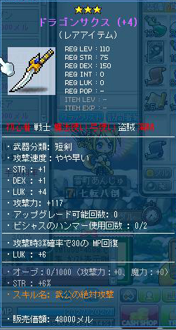 魂の書は、大工の魂で装備につけることができないので、魂の書を貼り付けるのは自分の装備できるものに限られてくるのですが……このドラゴンサクス、戦士も装備できます。