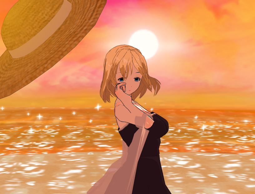 2・砂浜で海をバックにかぶっていた麦わら帽子が飛んでいき、耳に髪の毛をかけてるあんじゅ